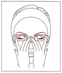 2. ใช้ นิ้วกลางของทั้งสองข้าง หมุนวนรอบดวงตาพร้อมๆกัน ในลักษณะวนตามเข็มนาฬิกา และแต่ละครั้งให้หยุดกดที่บริเวณหัวคิ้ว ทำแบบนี้ซ้ำทั้งหมด 60 รอบ